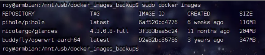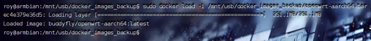 sudo docker load -i /media/devmon/ImgBackU/docker_images_backup/openwrt-aarch64.tar