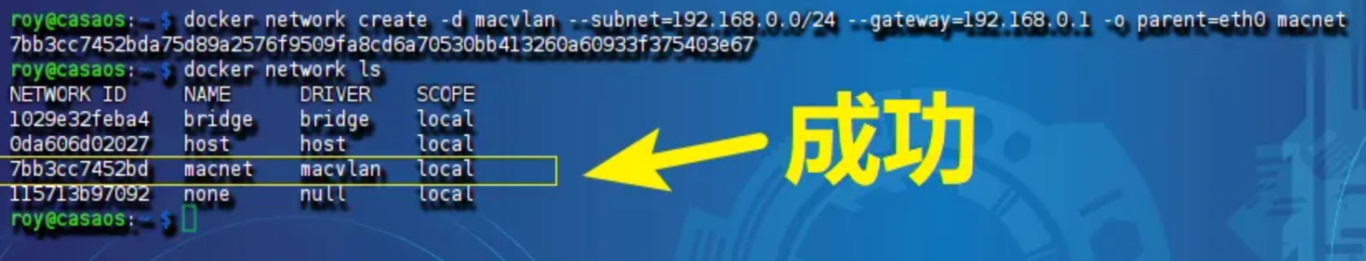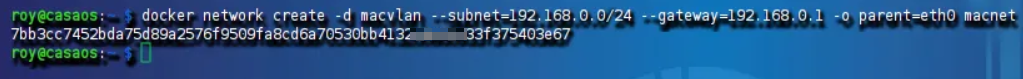 docker network create -d macvlan --subnet=192.168.0.0/24 --gateway=192.168.0.1 -o parent=eth0 macnet