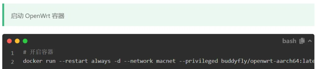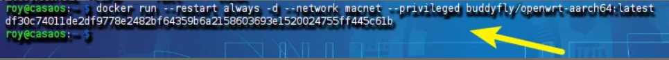 docker run --restart always -d --network macnet --privileged buddyfly/openwrt-aarch64:latest