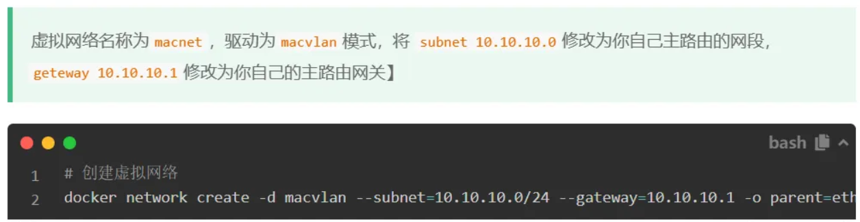 docker network create -d macvlan --subnet=10.10.10.0/24 --gateway=10.10.10.1 -o parent=eth0 macnet